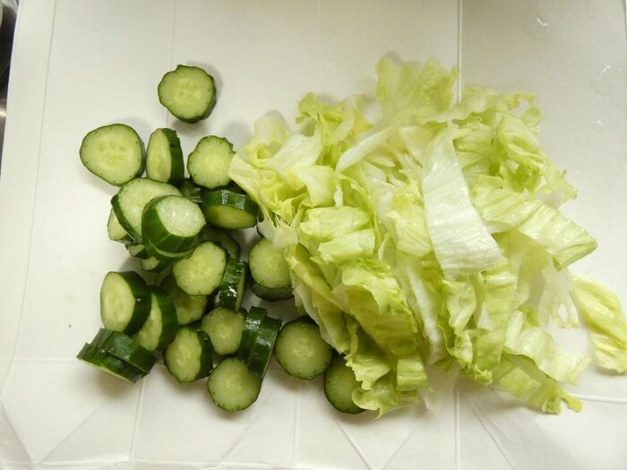 きゅうりは5㎜幅の輪切りにし、レタスは1㎝の細切りにします。