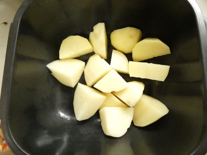 じゃが芋は1㎝幅の半月切りにし、耐熱容器に入れます。ふんわりラップをし、電子レンジ600wで3分半加熱します。