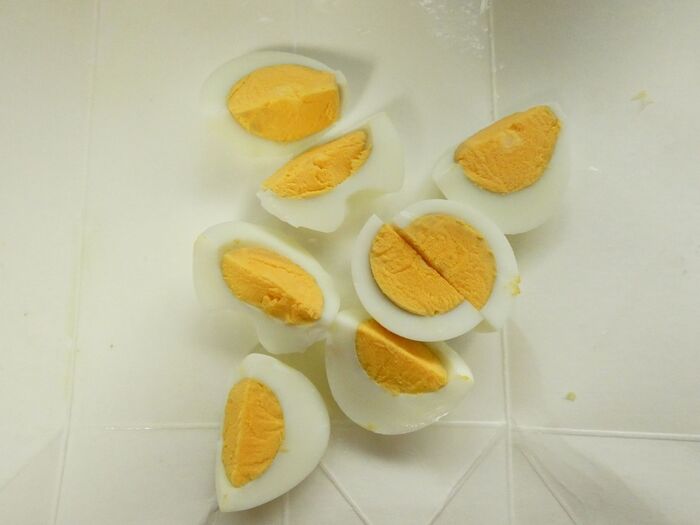 ゆで卵は1個を4等分にし、ひよこ豆は水気をしっかり切ります。