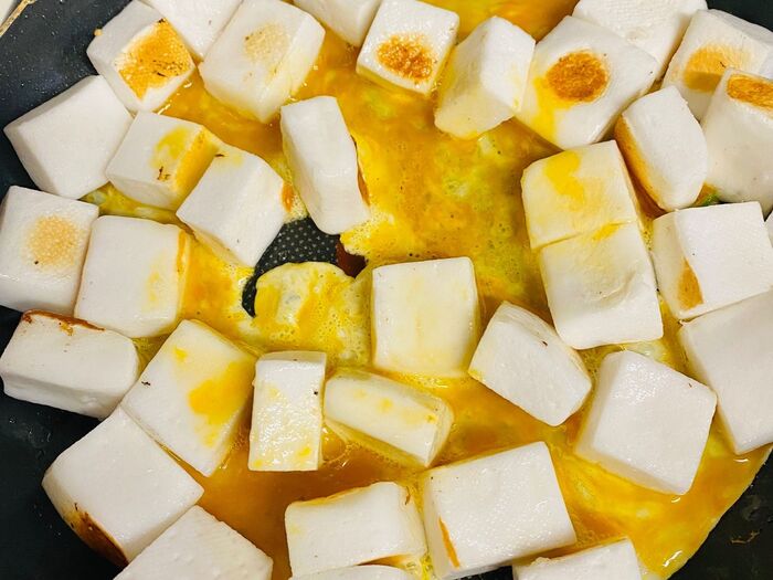 フライパンを熱し、バターを入れハンペンを炒めます。軽く焦げ目がついたら