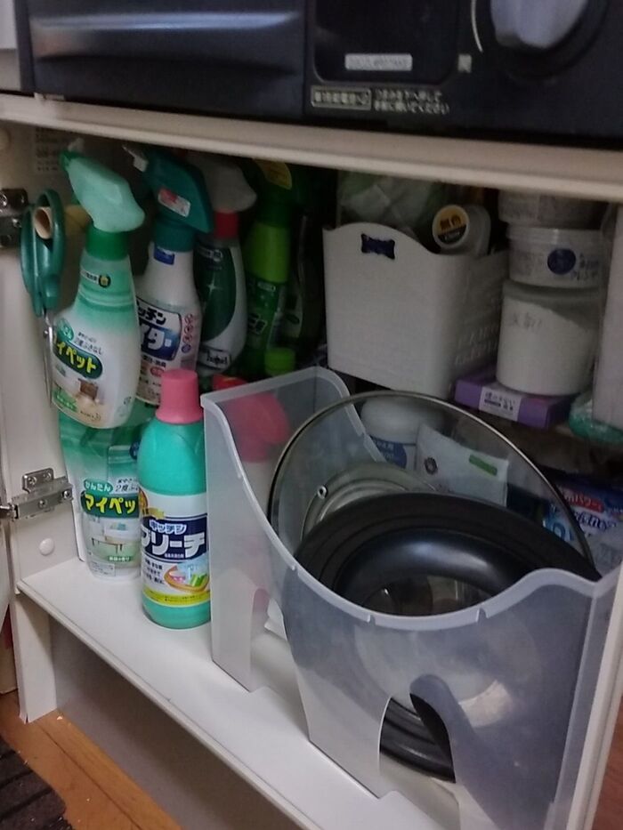 ガスレンジの下なので、開けてすぐの場所には鍋蓋置いてます。扉側に引っ掛けたいのですが、たくさんあり過ぎてファイルケース使用です。