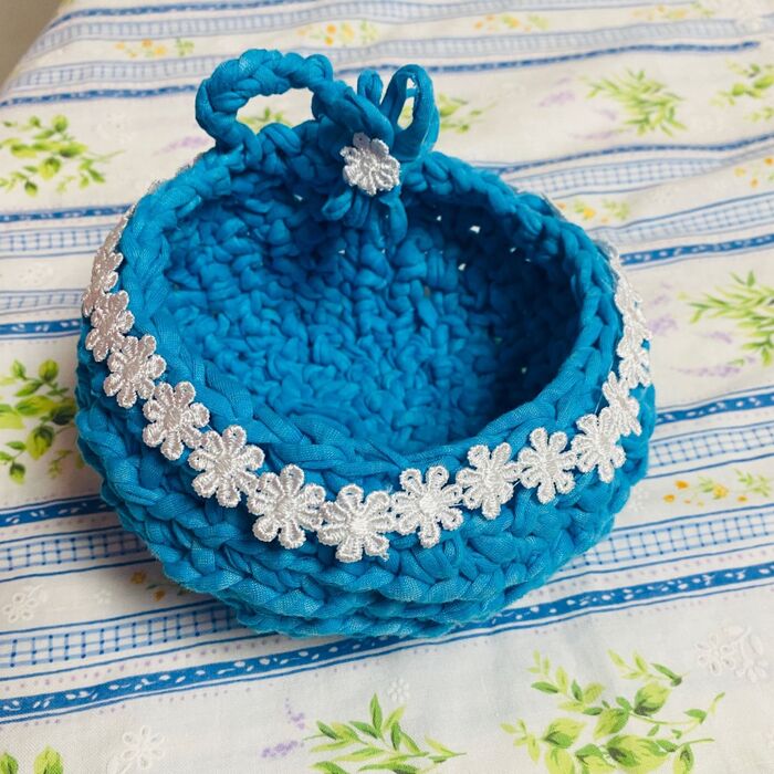 お好みでリボンを作り、レースの飾りを白い糸で縫いつけます。