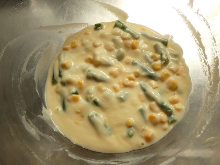 いんげんとコーンもあわせて、さらに混ぜ合わせます。