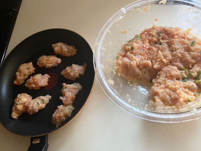 フライパンを熱し、油を入れ、小判型になるように丸め焼きます。