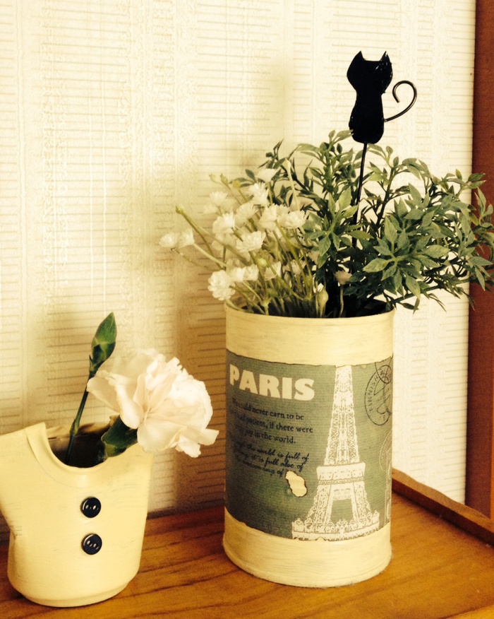 となりの洋服型のフラワーベースは【空き缶リメイク!洋服みたいなフラワーベース♪】↓で紹介しているものです。