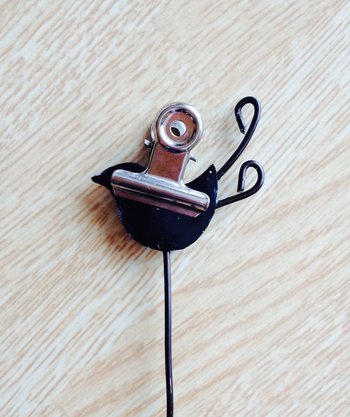 黒のアクリル絵の具(100均)で色を塗ります。乾いたらワイヤー(100均の1.5mm)を挟み込んで接着剤をたっぷり付けて留めます。乾くまでクリップで挟んでおくとワイヤーがしっかり固定します。