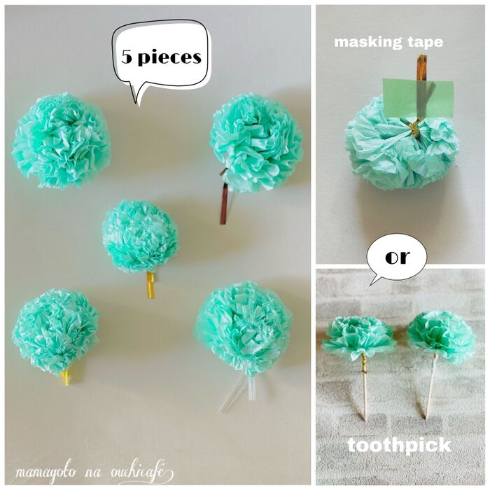 1本を3等分にカットして、それぞれ中心をラッピングタイでくくり固定します。