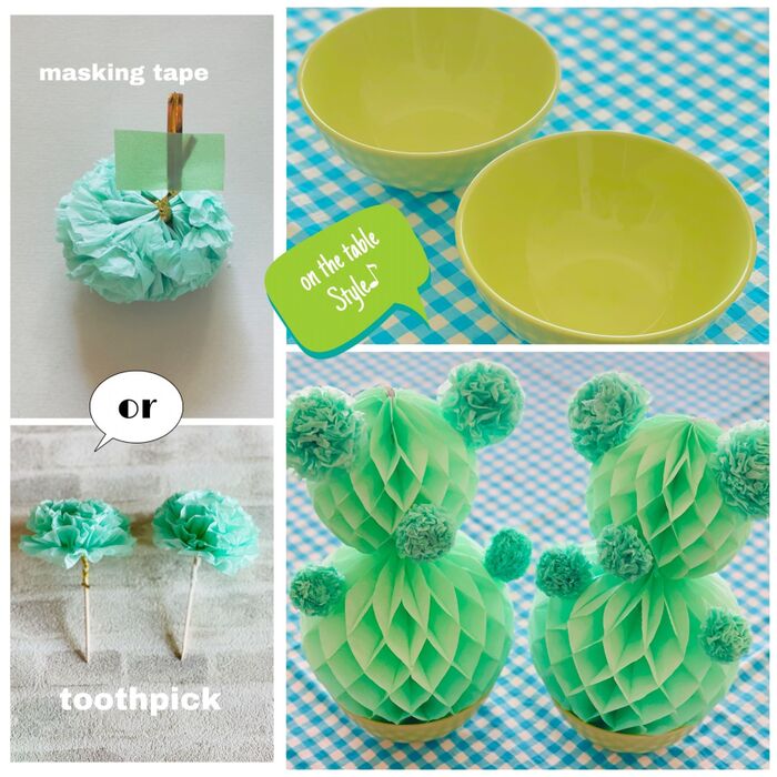 少しひらいたボールの中央くぼみの上に竹串を置き、マスキングテープで貼り留めます。