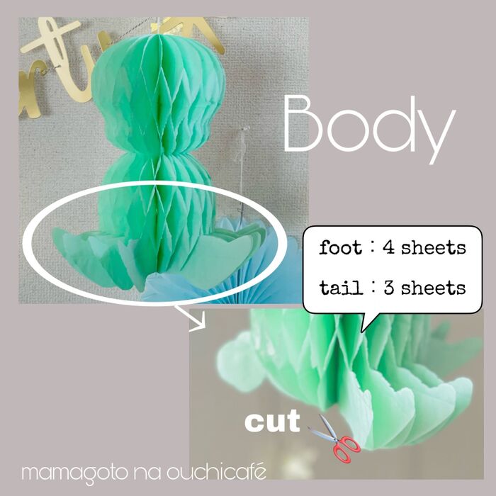 その際は、後で取り付けるフラワーペーパーポンポンで耳・手と同様に足を追加することも良いかと。