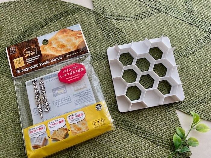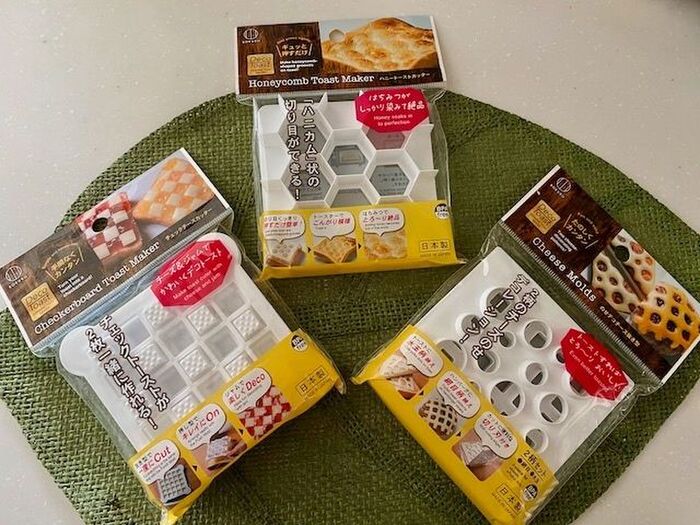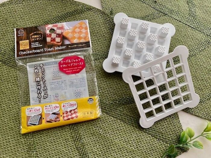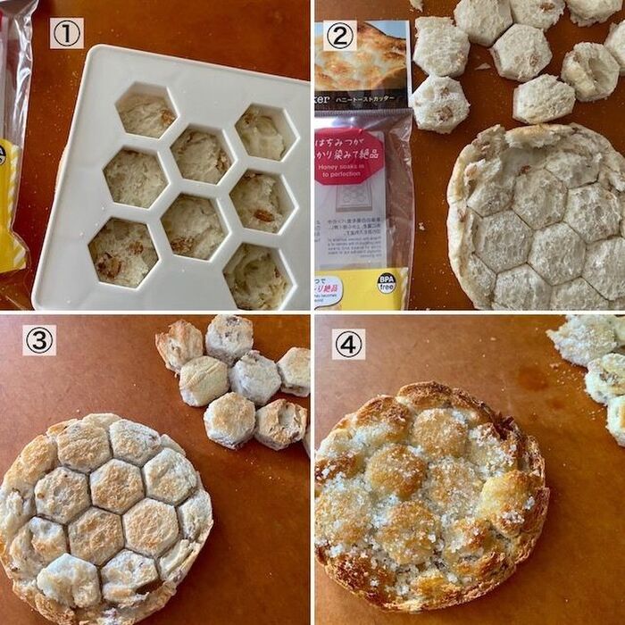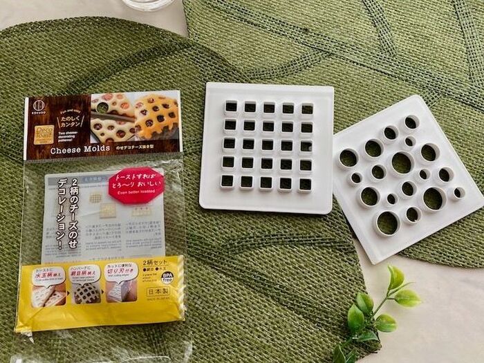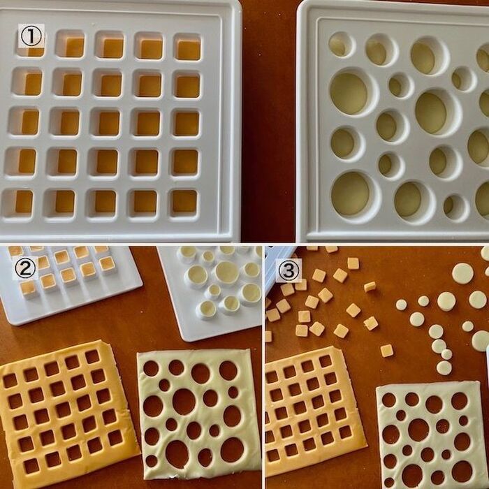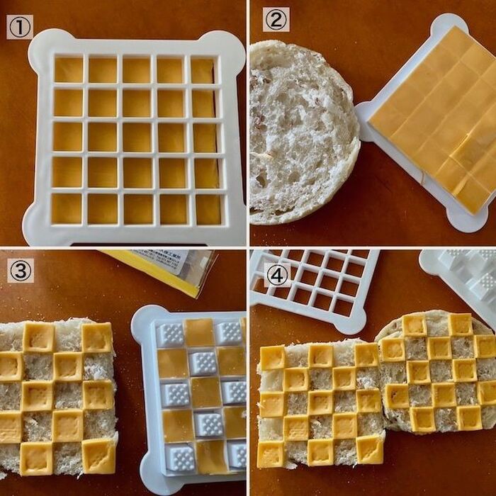 ③ 抜き型をパンに乗せたら 押し出し型を抜き型の上に置きチーズを押し出します