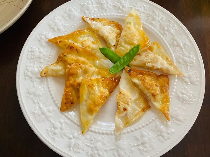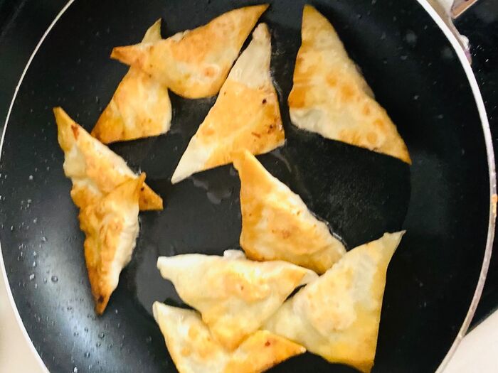 この同じ具材で油揚げのワンタン揚げを少し使って作りました。