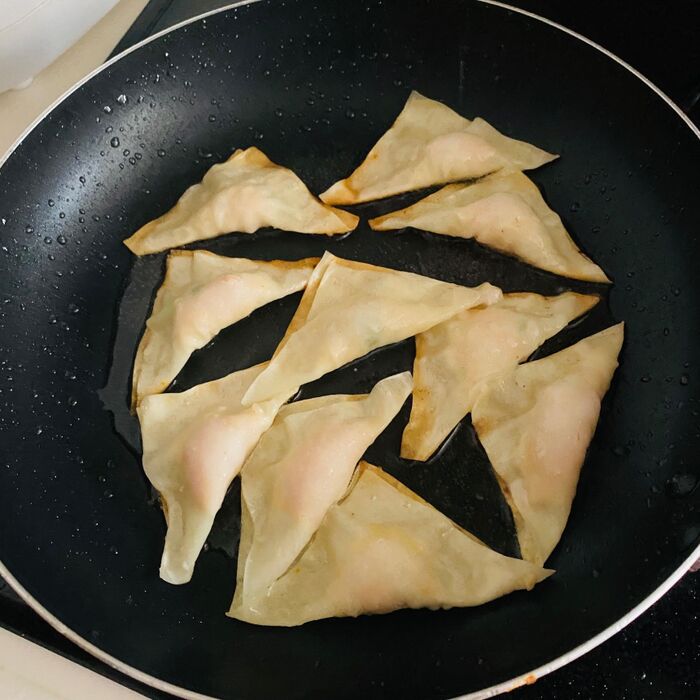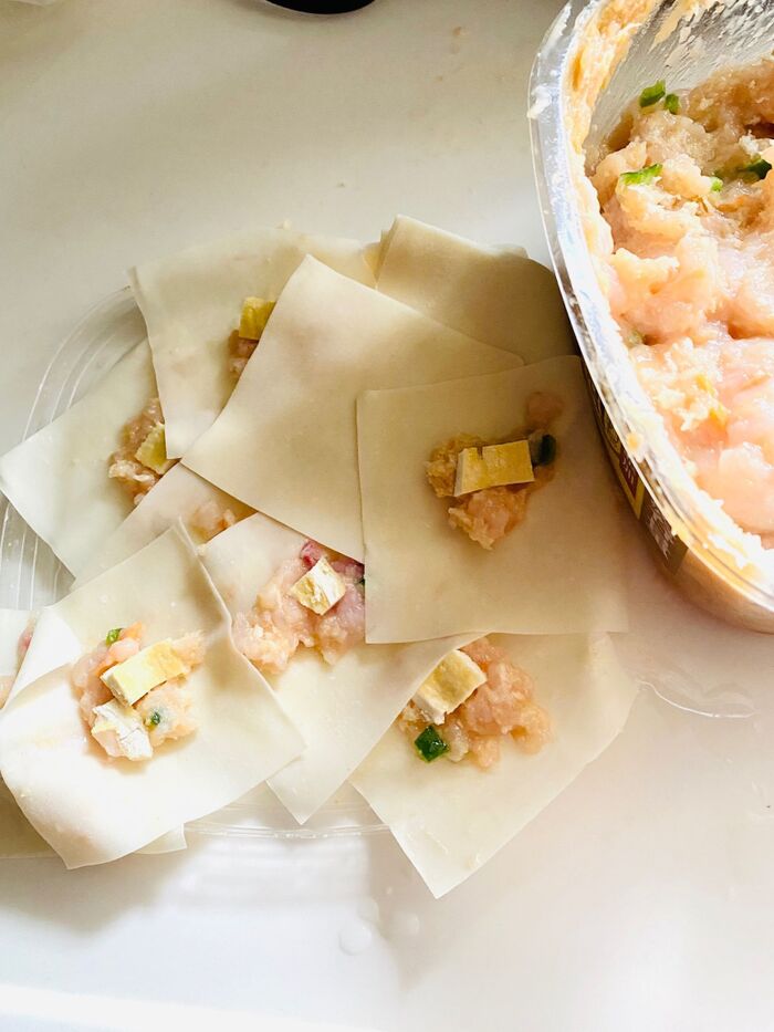 ワンタンの皮に乗せて、賽の目に切った油揚げを乗せて挟みます。