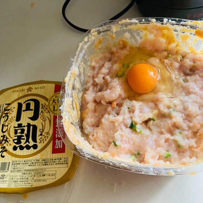 味噌の容器に味噌が少し残っていたのでボール代わりにしてミンチした材料を入れました。