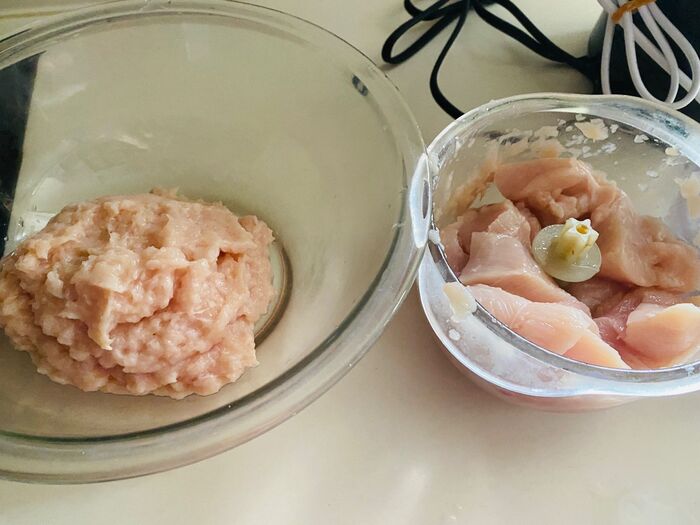 鶏肉を大まかに切ってフードプロセッサーに入れてミンチにします。