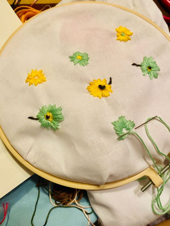 黄色、薄緑色、白色、緑系の茶色の刺繍糸を針に通しておきます。