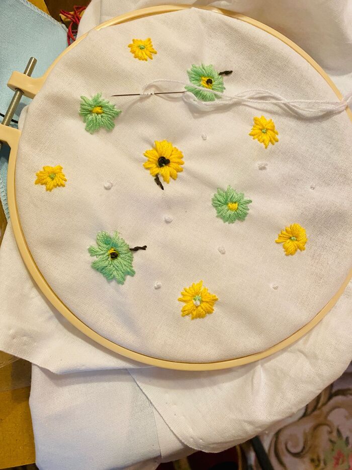 白色の刺繍糸で、間隔を開けてフレンチノットをします。