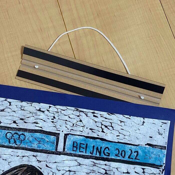 ハンガー部分をぱかっと開いて、絵をはさんで、掛けます。