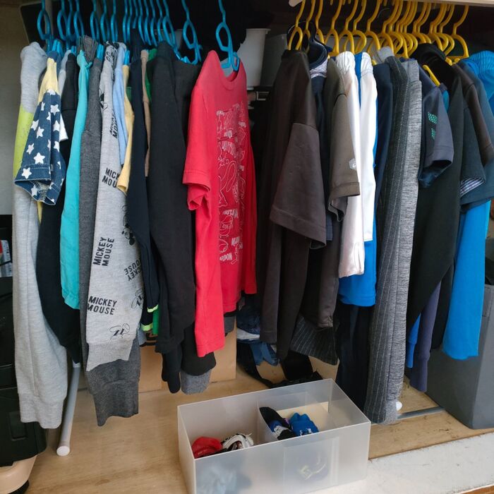 押入れに子供の洋服をハンガー掛けして収納しています。