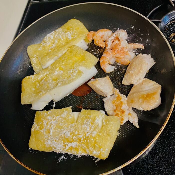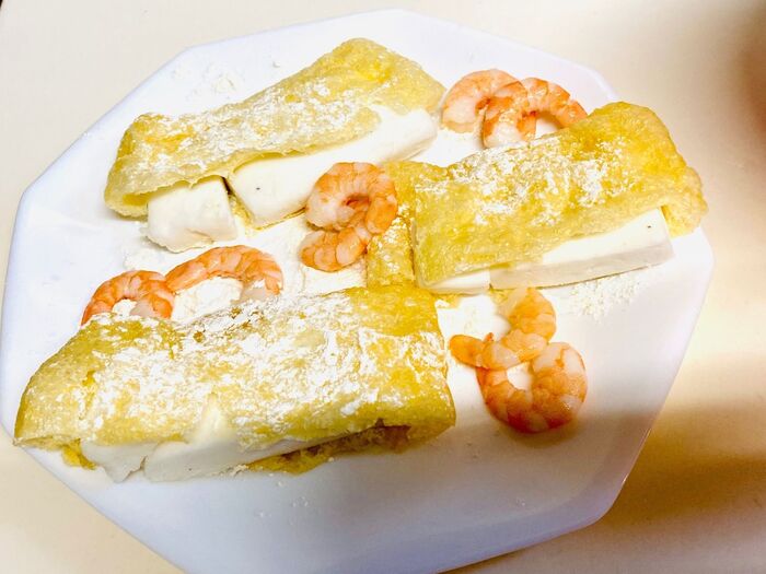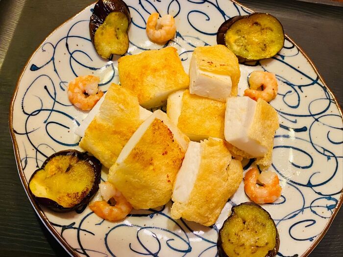 フライパンにごま油をひき、小揚げにはんぺんを挟んだものをカリカリに焼きます。