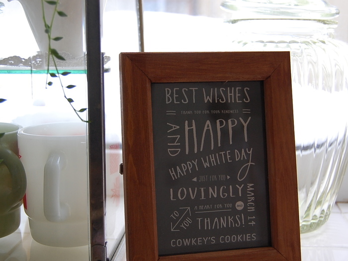 クッキーを売ってるお店のショップ袋がなんとも男前だったので、100均の額に入れたらカフェっぽくなったような気がしませんか!?