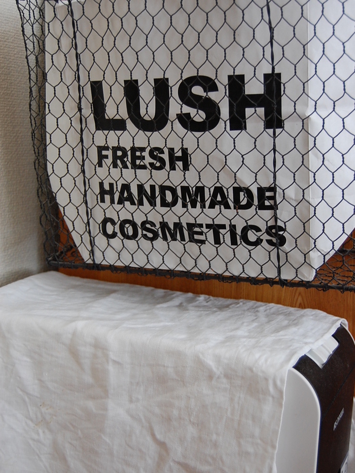 シュレッダーの上にシュレッダー待機中の物を入れてるワイヤーの籠にショップ袋を入れて目隠し。