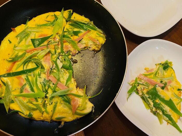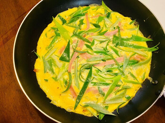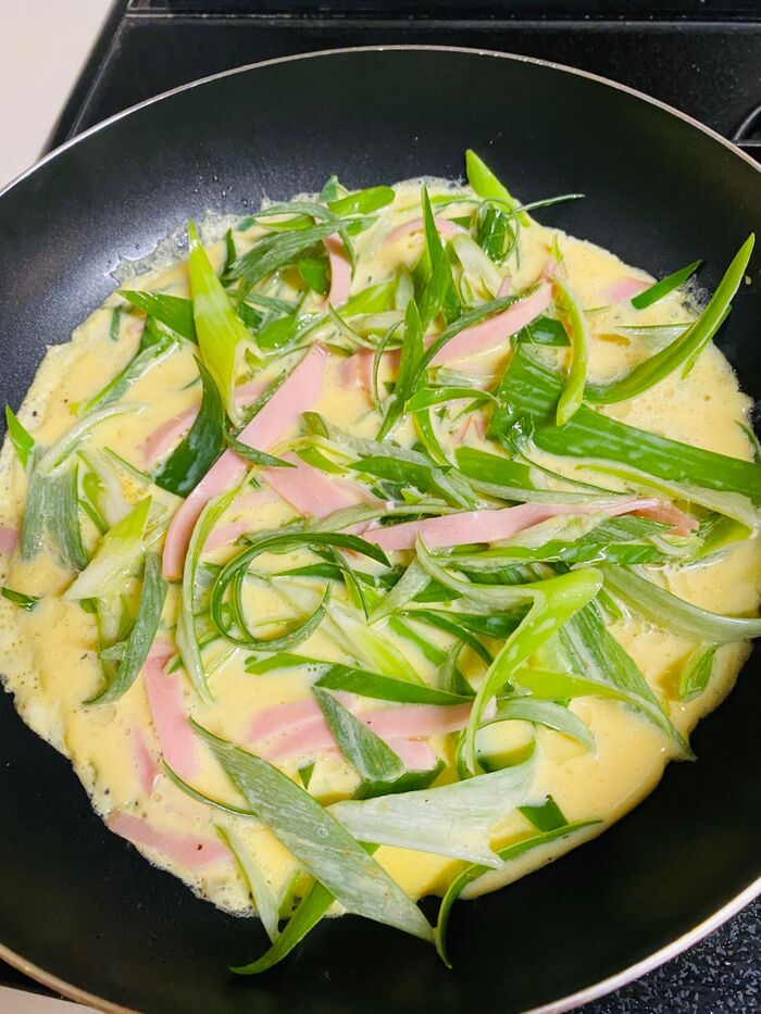 火を少し弱めにして、蓋をして卵に火が通るまでじっくり焼きます。