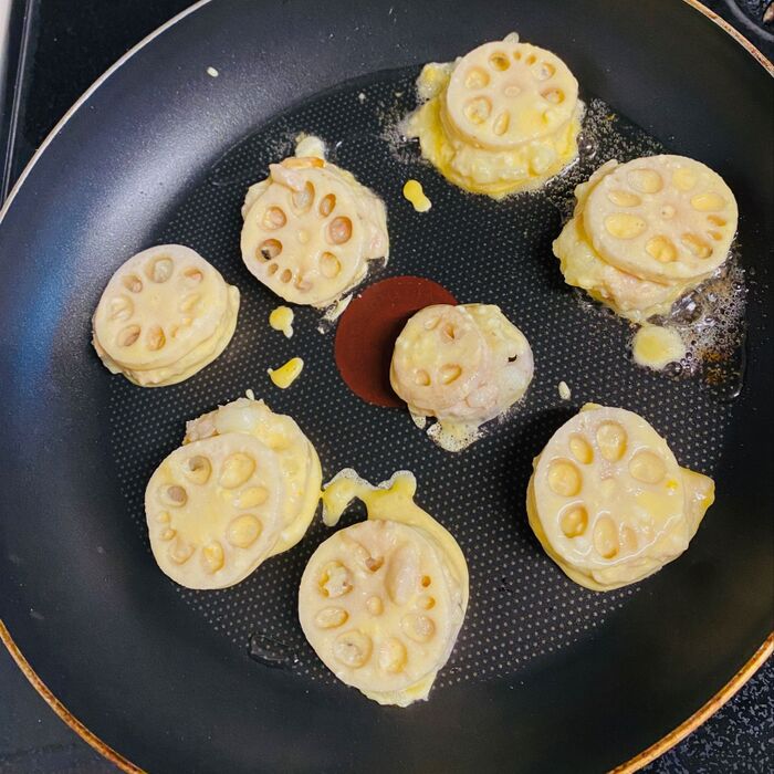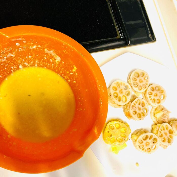 フライパンに油を入れ温まりましたら、レンコンに衣をつけながら、揚げ焼きします。