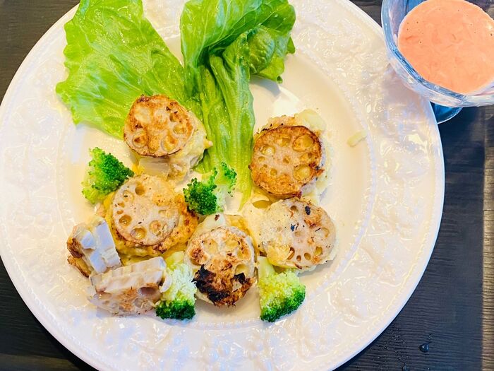 器に良く水気を切ったレタス、ブロッコリーの塩茹でを飾り(冷蔵庫にあったものです)、レンコンの挟み揚げを飾ります。