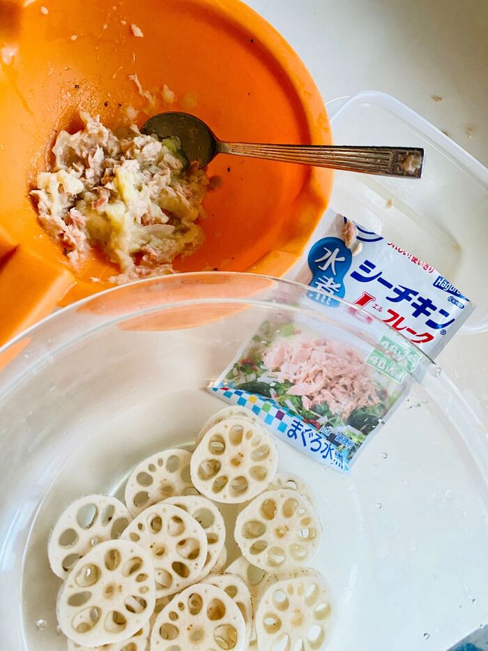 レンコンにツナポテトを挟んでいきます。