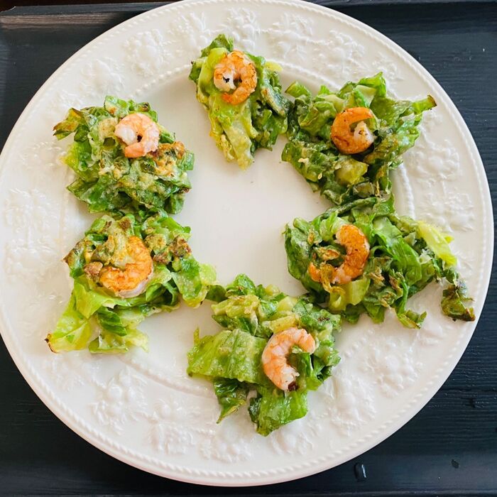 ②良く温めたフライパンに油を入れ、①をスプーンですくって入れてエビを乗せます。