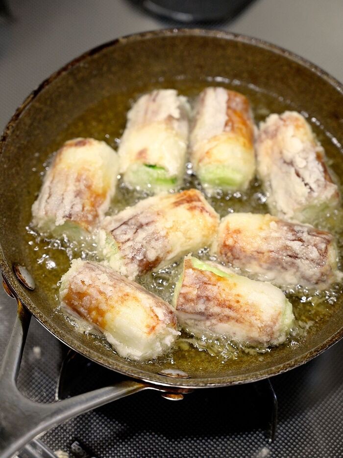 フライパンに米油とごま油を入れ熱した中に入れ、からりと揚げ焼きする。