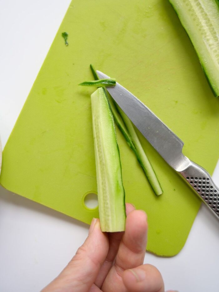 1:きゅうりはピーラーで表面をむき、横半分、縦半分に切り、