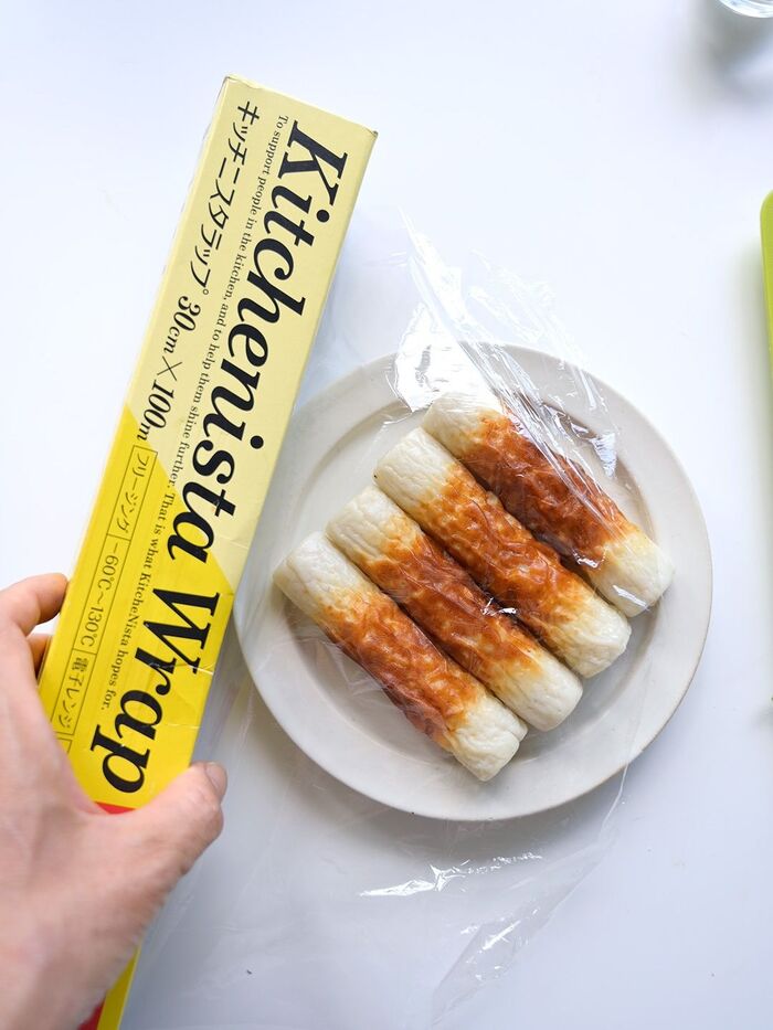 2:耐熱皿にちくわをならべ、ふんわりとラップをかけ、600wの電子レンジで40秒前後加熱する。(穴がよく伸びるようにするために加熱しています)