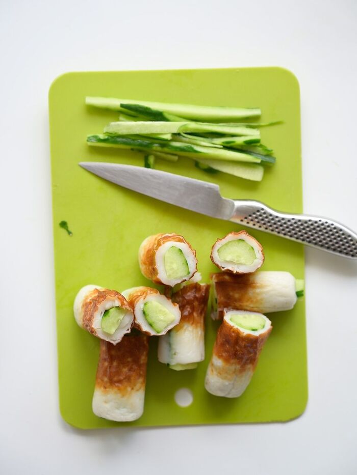 3:ちくわの穴にきゅうりを詰め、半分に切る。