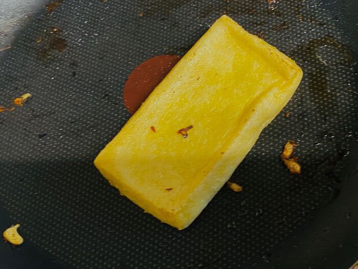 油揚げをテフロン加工のフライパンで両面カリカリに焼きます。