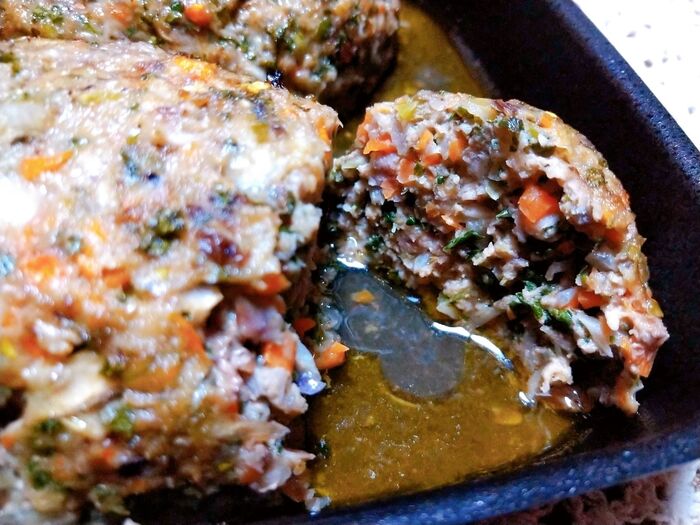 4.スキレットなどにオリーブオイルを塗りタネをまとめてかまぼこ型にまとめて形成。