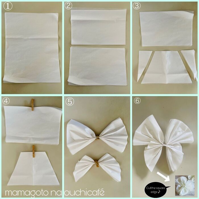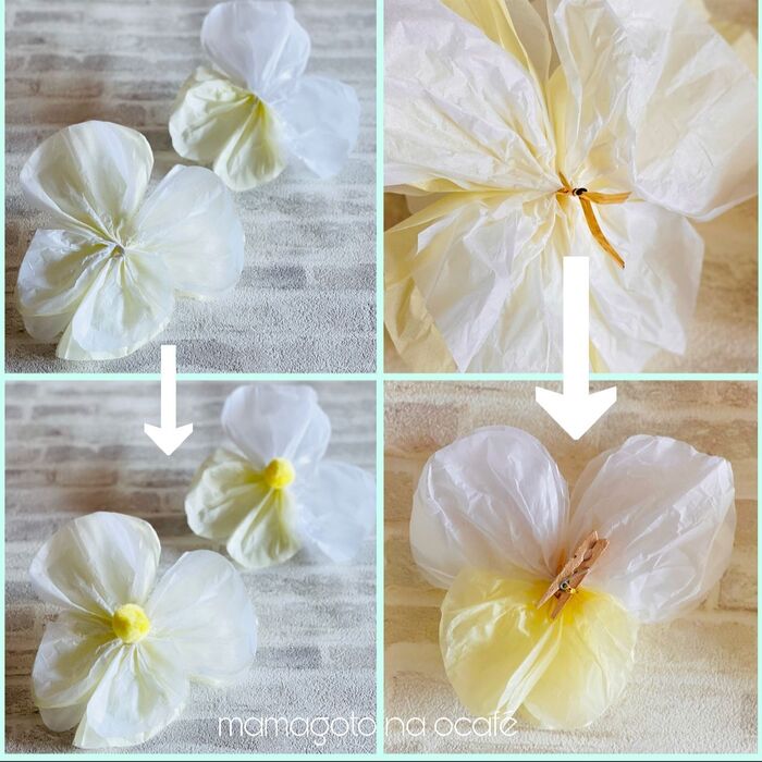 ④⑤⑥ ”③”の中心にそれぞれタックを寄せ、中央を2パーツ一緒にラッピングタイで括り留めます。