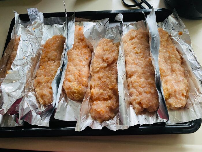 くっつかないアルミシートに棒状に入れ、ミートローフの形にします。