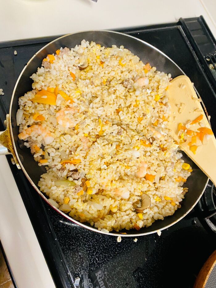 玄米押し麦ご飯を入れよく炒めます。ピーマンのみじん切りを入れ、