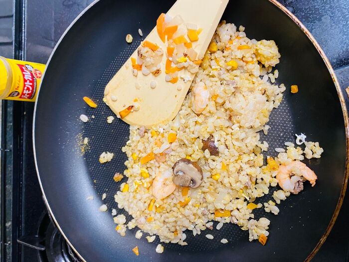 スライスしたマッシュルーム、ひき肉、えびを入れ炒めます。