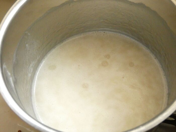 ふつふつしてきたら1分くらい混ぜ合わせ、火を止めます。あら熱が取れたら2に流し込みます。