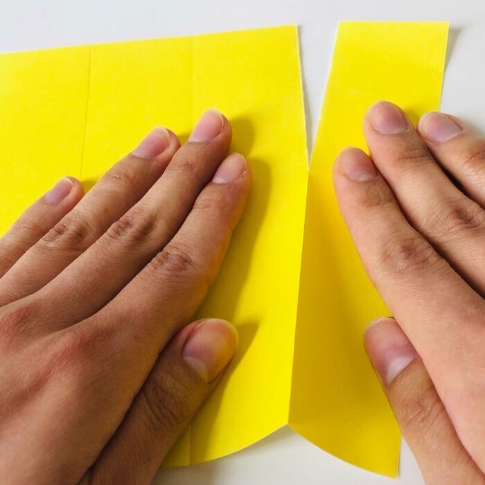 縦に4等分に折り曲げて、しっかりと折り目をつけたら手で切ります。