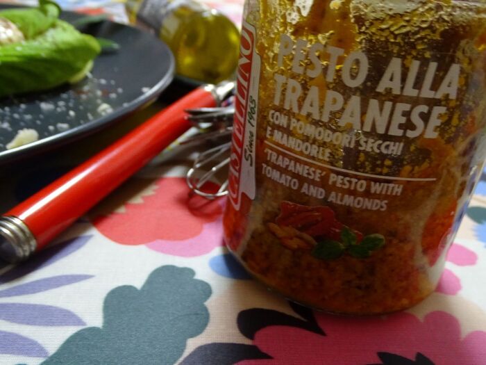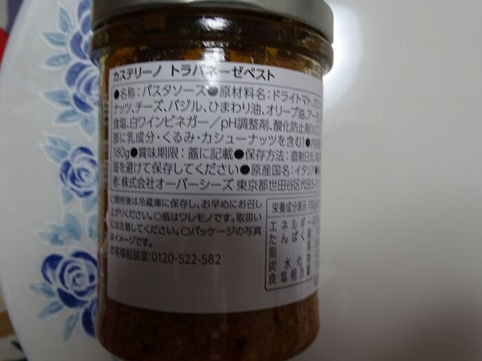 原材料名 ドライトマト、カシューナッツ、チーズ、バジル、ひまわり油、オリーブ油、アーモンド、食塩、白ワインビネガー/pH調整剤、酸化防止剤(V.C)、(一部に乳成分・くるみ・カシューナッツを含む)