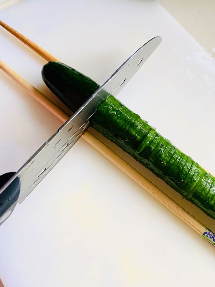 半分に切って菜箸の間にきゅうりを入れて、包丁で切り込みを細く入れていきます。