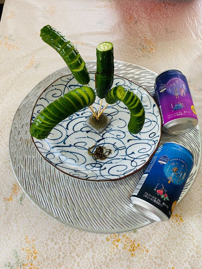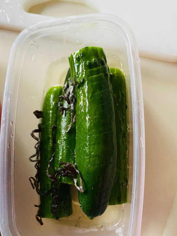 容器にキュウリを入れ、白だし、塩昆布を入れ、一晩漬け込みます。