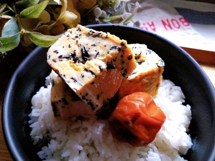 4.皿に麦ごはんを敷き卵焼きと梅干しをのせて完成