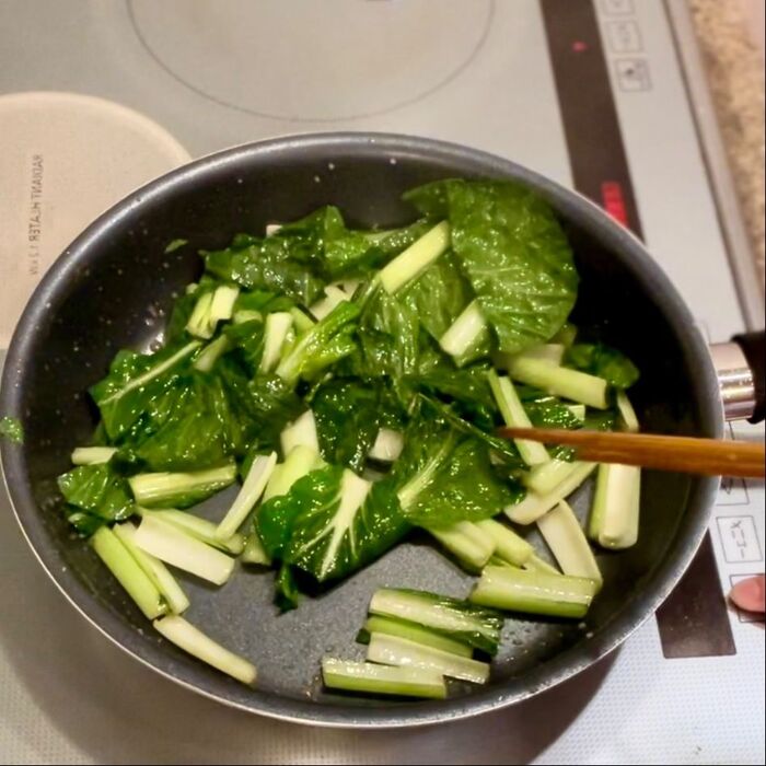 中火強~やや強火位で短時間で炒め上げます。(小松菜がシャキシャキが美味しい)