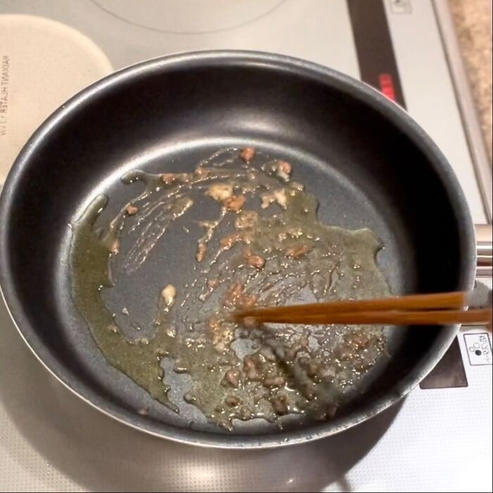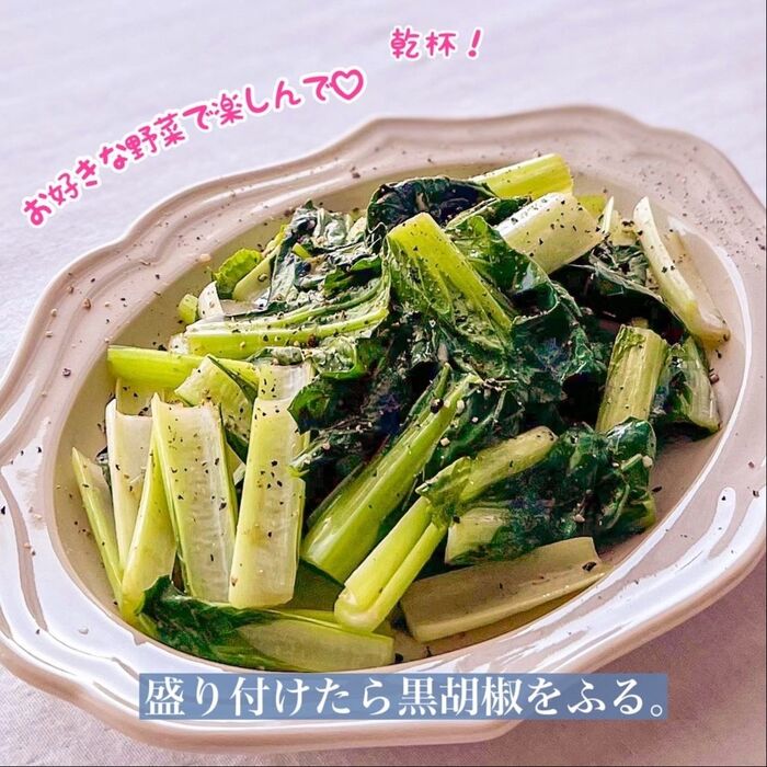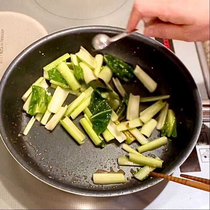 茎の部分から炒め、火が通ってきたら醤油を加え全体に絡める。