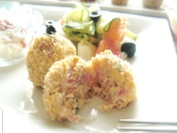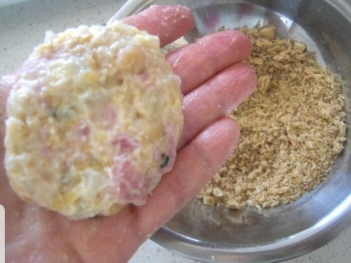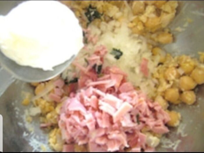 ハム、マヨネーズ、塩、パセリなどのハーブの微塵切りを③に入れてよく混ぜ合わせる。