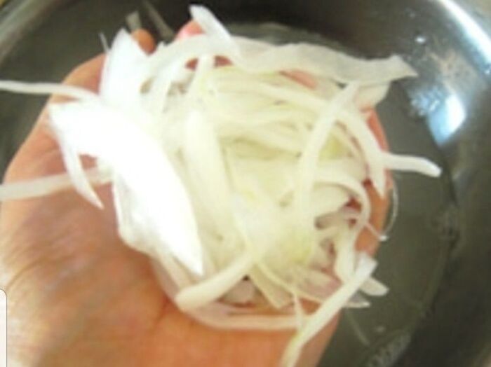 玉ねぎは薄くスライスして水に入れて1分ぐらい揉んで絞る。